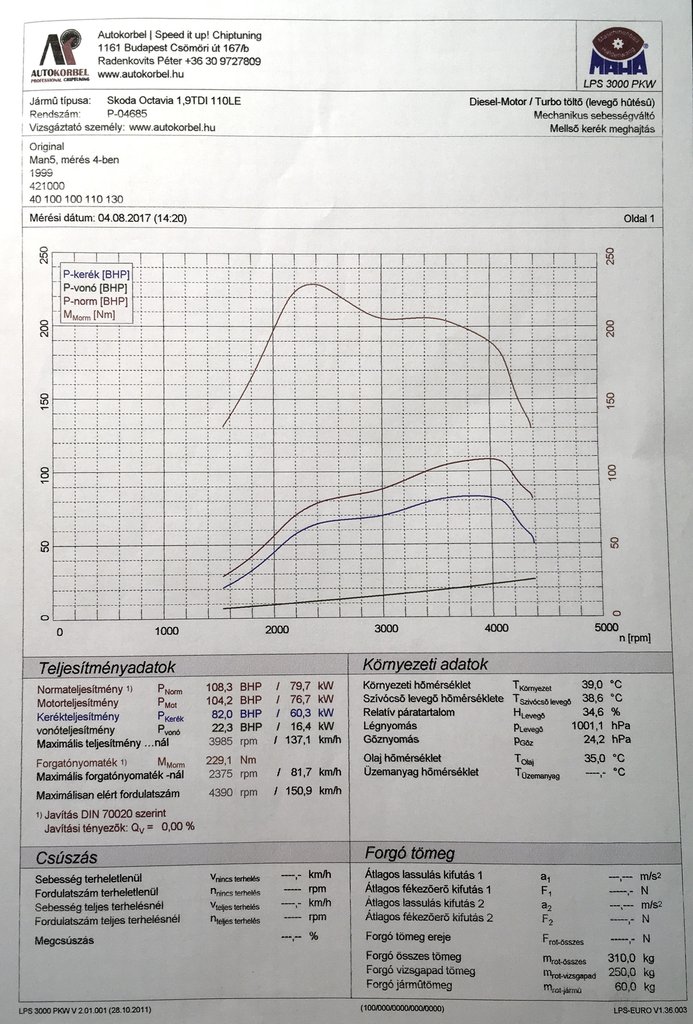 A diagramokat látva egészen elégedett voltam: 4090 ford/percnél 109,4 lóerő, és 2310-nél 228 Nm. A teljesítmény szépnek tűnik, de Autokorbeléknél járt már korábban hasonló motorral szerelt Audi és Volkswagen, amik 115 lóerő körül tudtak. A nyútonméterekből is elillant vagy hét, de a görbék szépek, alapvetően egészségesnek érzem én is a kocsit. Örülünk.
