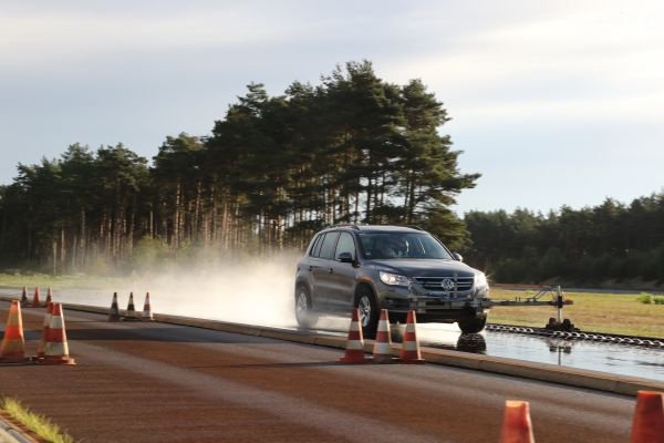Mostanában sokkal jellemzőbb télen a taknyos, nedves aszfalt, mint a több centis hóréteg vagy a tükörjég. Emiatt aztán az összértékelésbe is a vizes felületen mért értékek számítanak bele a legnagyobb súllyal. A Hannover közeli pályán a tesztpilóták hét milliméteres vízen gázolnak át, és azt is megnézik, milyen az, ha csak a bal oldali kerekek futnak nedves útra. Szerepel a feladatok közt gyorsítás, a vészfékezést pedig 80-ról 20 km/h-ra mérik.