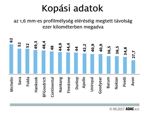 Szintén diagramon ábrázolták a kopást is. Itt minden egyes abroncsot több ezer kilométernyi használatnak tettek ki: konvojoztak és padon is koptatták őket. Egészen addig, amíg el nem érték az 1,6 milliméteres profilmélységet, amit lézerrel mértek. Igaz, azt is kiemelték, hogy téli guminál legalább négy milliméteres mintamélységet ajánlanak. Fontos, hogy a fogyasztáshoz hasonlóan a kopás is függ az autó típusától, méreteitől, hajtásától, a környezeti viszonyoktól. Itt az elsőkerekes, benzines Volkswagen Tiguannal elért eredményeket láthatjuk. A legtartósabb idén a Michelin Alpin 5 lett, amely a lehető legjobb osztályzatot kapta, 0,5-öst - ezt 62 ezer kilométeres futással érdemelte ki. Leggyorsabban az idehaza kevésbé ismert, de több mint száztíz éves múlttal rendelkező, versenygumikkal is foglalkozó Avon kopott, 27 700 kilométert bírtak a brit gumik.