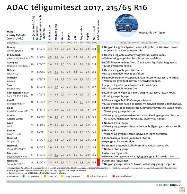 Éppen ezért az ADAC összesítő táblázata is csak azt tudja megmutatni, melyik gumi volt a legkiegyensúlyozottabb. Ebben a méretben egyetlen mintázatnak adtak jó értékelést: a Dunlop Winter Sport 5-nek. A népes középmezőnyben észrevehetjük, hogy sok guminál egy-egy részeredmény rontotta le az összképet, így hiába volt szinte minden összevetésben a legjobbak közt a Continental, ha jégen gyengélkedett, és hiába tartós a Michelin, ha nedves aszfalton visszafogottabban teljesített.
