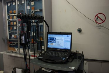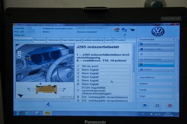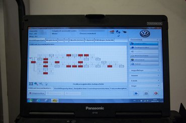 Beléphettem a műhelybe, amit egyszerű földi halandó előtt zárva tartanak, hogy működés közben nézzem meg a műszert, amit kívülállónak soha nem mutatnak meg. A Volkswagen diagnosztikai berendezése a legnagyobb kincs a szerelők kezében, hamisítják, utánozzák, pedig az eredeti a legjobb, és bizonyos hibákat nem csak megtalálni, de javítani is lehetetlen nélküle.