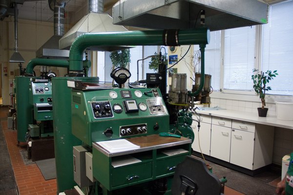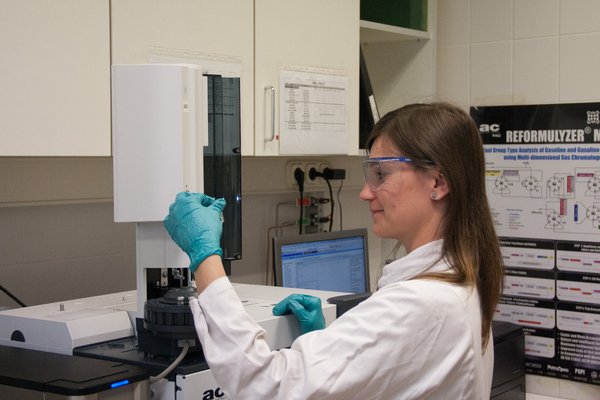 Be tudtunk nézni az oktánszám-ellenőrző laborba is, ahol a motormódszerrel, a kísérleti motor kompresszióviszonyát változtatva mérik a benzinek kompressziótűrését, és határozzák meg az oktánszámát. Az itt dolgozó kolléga több mint 40 éve kezeli a gépeket, 1991-ig orosz műszerekkel, ma amerikai kísérleti motorokkal dolgozik. A motorokkal nemcsak mér, hanem szigorú üzemórás tervek szerint karbantartja, és újítja fel őket.