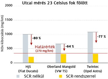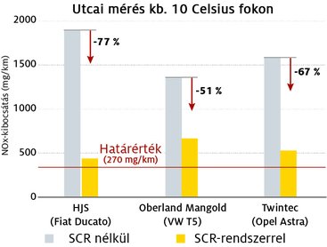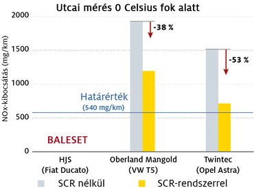 Télen már a duplájára emelt, 540 mg/km-es határértéknek kellene megfelelni, de ez egyik résztvevőnek sem sikerült. Az Oberland Mangold T5-öse nagyon messze volt tőle, de a Twintec közel járt. Jobb energiagazdálkodással, az utólag beszerelt SCR-rendszer jobb hőszigetelésével akár teljesíthető is lehet a norma.