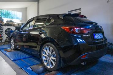 A mérésre érkezett Mazda 3-ba a legerősebb kétliteres G165 jelzésű motor került, ahol a marketingelnevezés a teljesítményére utal. A motor teljesen könnyűfémből készült motorblokkból és hengerfejből áll, 16 szelepes DOHC vezérléssel és folyamatosan változtatható szelepvezérlési időkkel, illetve extra nagy 14:1 kompresszióviszonnyal. Minimálisan 95-ös benzint ír elő a Mazda ehhez az autóhoz, ezért számos olyan megoldást alkalmaztak, amely csökkenti az öngyulladásos égési hajlamot és a kopogást.