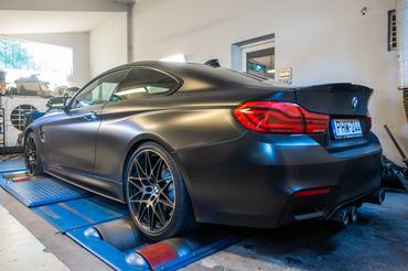 Az BMW M4-hez hasonlóan erős autók teljesítménymérése mindig nehezebb, mert a hajtott kerék nehezen tapad meg a mérőgörgőn. Ezúttal is súlyokat tettünk a csomagtartóba, megmelegítettük az abroncsokat a jobb tapadás érdekében, majd elindítottuk a mérést. Azonnal érezhető volt az autó által leadott jelentős hő, és valahol 3000-4000-es fordulat között a hangja is nagyot változott: mélyebb és erősebb lett. Ezzel egy időben a BMW feneke kicsit megült és érezhetően jobban nekifeszült a padnak.
