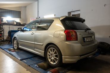 A Toyota Corolla kilencedik generációja E120 (máshol E12) kódnéven annak is a legerősebb változata szerepel a mai Erőmérőben. 1796 cm3-es, 2ZZ-GE kóddal azonosítható motort találhatunk benne; a Toyota rendszerében ez a jelölés a nagyon elterjedt szívó benzines ZZ-sorozatot és a DOHC Performance hengerfejet, illetve a hengerenkénti befecskendezést takarja.