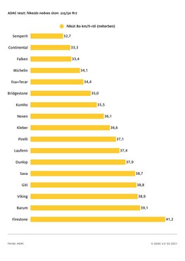 Ha ezek az osztályzatok nem lennének elég beszédesek, meg egyébként is túl sok tényezőből tevődnek össze, akkor nézzünk egy részeredményt. A nedves úton való fékezés elég fontos és szemléletes példa. Míg a Semperittel 80 km/h-ról 32,7 méter alatt tudtak állóra fékezni a tesztelők, és a középmezőny is 36-37 méter körül tudott maradni, addig a Firestone-nak ugyanehhez 41,2 méterre volt szüksége. A legjobbhoz képest majdnem tíz méter a különbség, azaz bő két személyautónyi. Ez nagyon sok, különösen vészhelyzetben.