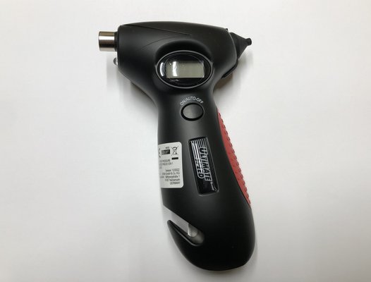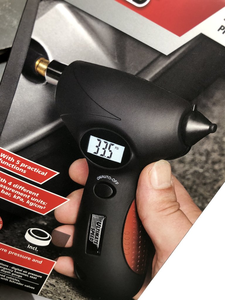 A gumiabroncs futófelület-mélységét mérő kis pálcikát nem teszteltük, nem nagyon van mit tesztelni rajta, nem mér semmit, csak jelzi, hogy a piros tilos, a sárga még elmegy, a kék meg jó. De ugye nem mindegy, hogy nyári vagy téli gumit nézünk, melyik országban, satöbbi. A guminyomást mérő műszer már érdekesebb, azt már érdemes volt alaposabban megnézni – de nem mondom el, hogyan zajlott a mérés és ellenőrző mérés, legyen olyasmi is, ami csak a videóból derül ki.