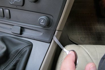 Az XC70-ben könnyű bejutni a rádió mögé, a váltó előtti kis tolltartó elemet kell csak kipattintani, kétoldalt benyúlva valami lapos, nem éles és szögletes tárggyal, hogy ne sértsük meg a felületet. Ilyen pl a telefonok szétszedésére is szolgáló lapos műanyag feszítő vagy esetembe pont odafért egy kiskanál nyele, ami szintén legömbölyített élekkel rendelkezett.