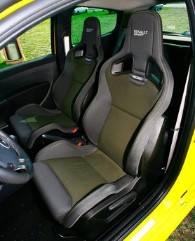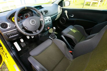 315 000 forint felár két sportülésért persze elég sok pénznek tűnhet, de ezek az állítható, légzsákos Recarok nem a kínálat legaljáról valóak, hibátlan az ergonómiájuk, vasmarokkal tartanak és cefet jól néznek ki. Nem utolsó sorban pedig jelentősen hozzájárulnak a versenyautó-érzéshez, csakúgy, mint a kormány középállását jelző sárga varrás. Maga a kormány átmérője optimális, fogása jó és nem csúszik rajta az izzadt kéz sem, szinte kéjes érzés markolászni, valószínűleg ezért nem hiányzott a könyöklő. A váltókartól azonban messzebb van, mint a Twingo RS esetében.