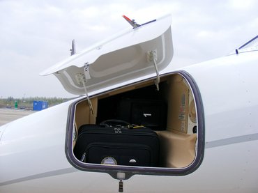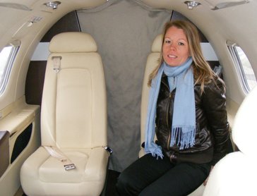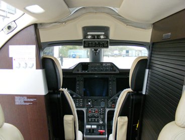 Elég hideg volt, így hamar a gép belseje iránt kezdtem érdeklődni. A teljes egészében lenyíló lépcső egyedi a kategóriában: ilyet csak a nagyobb gépeknél alkalmaznak, az ehhez hasonló kisgépeknél a gyártók általában megelégszenek az oldalra kihajtható ajtóval és két lehajló lépcsőfokkal. A gépbe lépve a 150 cm-es belmagasságú kabinban, ami a legnagyobb a kategóriájában, fejünket kissé lehúzva tudunk eljutni valamelyik ülésig, ahol aztán kényelembe helyezhetjük magunkat. Az egész belsőnek elég erős biznisz kisugárzása van, lágy bézs színek, finom bőrök, fabetétek, asztalkák - nem is értem, hogy mit keresek én itt. Valahogy csak öltönyös, nyakkendős üzletemberekkel tudom elképzelni, de ilyen egy sem volt jelen, leszámítva a gép két, egyenként négy csíkos kapitányát.