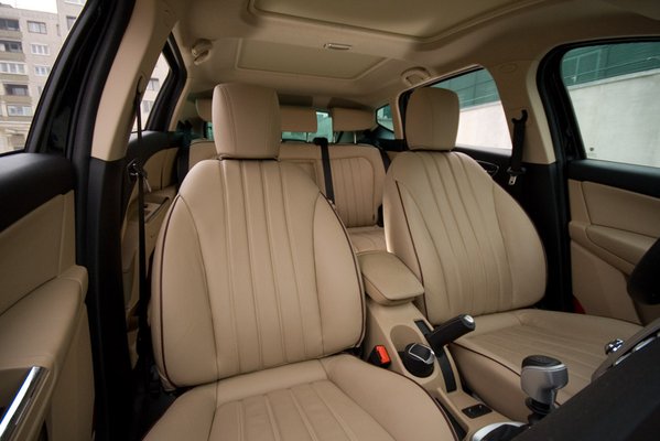 Amúgy a belseje döbbenetes méretű, ha visszaraknák a Bravo orrát rá, nyugodtan mondhatnák azt, hogy ez egy Bravo-Max, Bravo Plus vagy Bravo Scénic – de azt nem lehetne ennyiért árulni. A kasztni közepébe betoldott tíz centi miatt óriási a lábtér, még arra is volt hely, hogy a hátsó padot tologathatóra csinálják, sőt, a támlák külön döntögethetők. A pad meg úgy néz ki, mint egy rugós sezlony, igaz, ha az ember a felét előrehúzza, kiderül, hogy kamu. De szép. Ennél már csak a bőr szebb, ami borítja. Gyönyörűen megvarrt hurkák, bézs szín, finom tapintás. Egy BMW ülésén a bőr ehhez képest smirgli, komolyan mondom. Igaz, az első ülések furcsán domborúak, mintha egy fittlabdán ülnénk. Lehet, hogy ez még jót is tesz a deréknak.