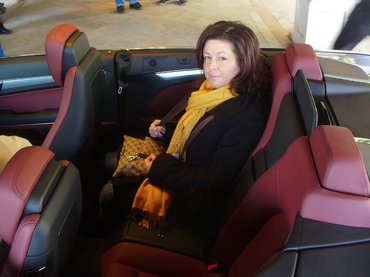 Human-interface tesztre is módunk nyílt, mert a bemutató másnapján hozzánk ült be a Mercedes píárosa. Na most. A píáros – érthetően – jobban elfér kis helyen, jobban érzi magát zajban és huzatban, ha a saját márkája autójában ül, és ráadásul újságíró vezet. De azért mindennek van határa, s mi ezt a határt kerestük. Kozári Edina 156 centi magas. Én a jobb egyen valamivel előrébb húztam az ülést, de a térdem még nem ért a műszerfalhoz. Így mindketten elfértünk, ezt szemrevételezéses úton ellenőrizte Szécsényi Gabi, aki onnantól sofőrösködött.