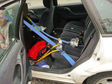 Négypontos raliöv szinte létszükséglet, mert gyűlöli a hagyományos, három pontos automatát, ami egy kicsi, ráadásul rossz lábú embert pont a legrosszabb módon feszít ki. A négypontos öv hátsó bekötési pontokra csatlakozik úgy, hogy a hátsó övek is megmaradtak, bár Péter mögé hátra úgyse ül senki. A Mozgássérültek Egyesületénél még mindig csodálkoznak, ha valaki raliövet rendel, pedig a hárompontos automata öveket nagyon nem a mozgássérülteknek találták ki, „megránt, kifeszít, és távolabb vagyok a kormánytól, utána meg elenged. Lehet persze, hogy kicsit nagy gázzal közlekedek.”