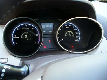Bár a többségnek kívülről tetszett az ix35, a belseje miatt viszont sokan fanyalogtak a külföldi kipróbálók közül. Hogy ismételten bizonyítsam a rossz ízlésemet, nekem éppen belül jön be inkább, kívül kevésbé. Ahhoz képest, hogy SUV, a kerékjárati ívek nagyon közel vannak a gumikhoz, amik kicsiknek tűnnek emiatt, a kocsi magas, de úgy próbálták látszatra alacsonnyá tenni, hogy az elején, meg különösen a hátulján a lehető legalacsonyabbra tették a grafikai elemeket. Így meg olyan, mint egy hátát púpozó macska, ami jól áll egy Jaguar XJ-nek, ami hosszú és lapos, de már nem annyira az ix35-nek, ami jóval rövidebb, viszont sokkal keskenyebb és magasabb. Nem rossz a design, de nem tudja, hogy szögletes akar-e lenni, kerekded, vagy ilyen fényekkel játszós, mint a Bangle-féle formák. Például a Ford Kuga, a VW Tiguan harmonikusabb, igaz, az arcát egyméteres magasságban hordó, szörnyű Renault Koleoshoz képest az ix35 egy Mona Lisa.