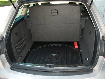 Úgyhogy nem is üldögélünk sokáig a hátsó ülésen, hanem gyorsan kiszállunk és megnézzük a csomagtartót. 442 liter. Egyszerűen előállíthatunk egy nagyobb rakteret, ha ledöntjük a hátsó támlákat. Könnyen megy, bár mindennek elég komoly, audis tömege van, főleg, hogy még a csomagtérrolót is rajta hagyhatjuk a támlán. Lesz egy sík rakterünk, ami még mindig inkább kicsi, mint nagy. Alatta, külön fedéllel takarva egy legfeljebb két adóbevallás tárolására alkalmas rekesz, legalul pedig meglesz ám a tér, csak sajnos légmentesen ki van töltve egy teljes értékű pótkerékkel és a szerszámkészlettel.