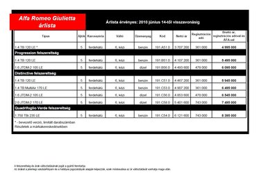 Jelenleg egy bevezető verzióval indul a Giulietta, 5000 forinttal az ötmilliós határ alatt. A 105 lóerős JTDm2-es turbódízel a belépő, Progression felszereltséggel 6 095 000 forintba kerül, ami 200 ezerrel több, mint a Golf Trendline 1.6 CR TDi. Ennyiért az Alfa kétségkívül több extrát ad, kérdés, hogy a hiper árérzékeny szegmensben ez mennyire lesz elég.