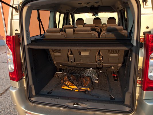 A hátsó traktusban bőséges csomagtér van alaphelyzetben is, jó egy méteres mélységű. De az ülések variálásával egészen 2,5 méterig nyújthatjuk, amivel egy hirtelen jött felújítást is le lehet zavarni egy körben. Külön előny, hogy a csomagtértakarót a tolóajtó mögötti oszlopnál is tudjuk rögzíteni, így a második sor kivétele esetén is meg tudjuk védeni a szállítandó holmit a kíváncsi szemek elől. Persze, ha árut szállítunk, akkor nem túl előnyös, hogy ez a változat végig szőnyegpadlós, érdemes valami védelmet odateríteni. A padlóba és az oldalfalon megtaláltam a szokásos rögzítőfüleket, így egy csomagtérháló segítségével megakadályozhattam a hátizsákom önálló életre kelését.