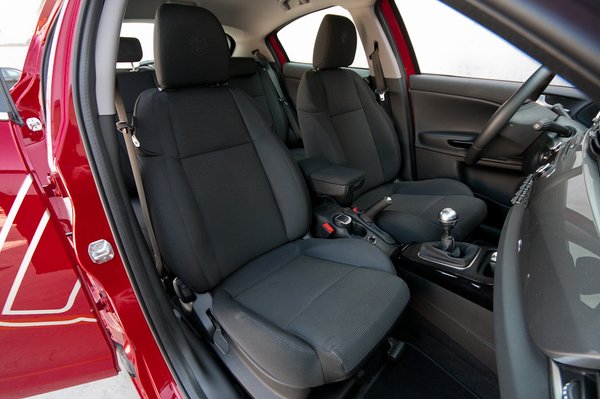 De nem nagy baj. Ugyanis belül egészen vonzó kis világot alakítottak ki, igazából talán a kormányoszlop alsó burkolatán lehetne egy kicsit akadékoskodni, ám minden más tisztességesen megcsináltnak tűnik. A műszerfal teljes szélességében terpeszkedő műanyag fém talán túl csillogó, de ehelyett kérhető mondjuk Alfa-vörös tízezerért, és akkor talán nem vakít annyira, ha süti a nap. A műszerek gyönyörűek, és szokás szerint függőlegesen áll a nullán a sebesség- és fordulatszámmérő mutatója.