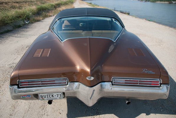 Andrásé egyébként a legszebb harmadik szériás Riviera, hiszen csak az 1971-es autókon van a csomagtérfedélen a szellőzőrács. 1972-re ezt befedték, mert bizonyos sebességeknél beszívta az esőt, kipufogógázokat. Ma már nem látjuk viccesen nagynak az ablakokat a kocsin, inkább izgalmas stílusvonásnak. És itt még a hajlított, karosszéria vonalába simuló lökhárítók vannak, nem azok a szörnyű, biztonsági téglatestek, amiket 1973 után minden Amerikában forgalomba hozott kocsinak kötelező volt viselnie. Az első Riviera forradalmat hozott Amerika autótervezésébe. A harmadik széria pedig elegánsan lezárta a kort.