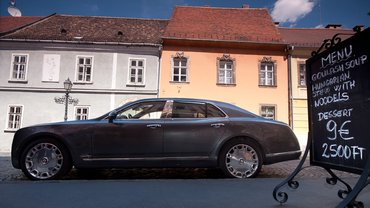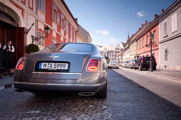 Mulsanne-unkhoz jár egy autótelefon is, ami jó szolgálatot tehet, ha otthon felejtettük a másfél milliós Vertu-t: ezt is hanyagul kidobhatjuk az asztalra. A multimédia hátulról is irányítható, miközben szorgos gépkezek gyúrják a hátunkat, ugyanis valamennyi ülésben van masszázsfunkció. Két hibát fedeztem fel a beltérben. Ahhoz képest, hogy a Mulsanne-ba saját lábúlag hajtottam bele a 800. kilométerét, a bal hátsó üléshez tartozó intarziás faasztalkát már nem lehet kihajtani, mert a konzoljából kiszakadt egy csavar. Továbbá a jobb hátsó oldalablakhoz tartozó árnyékoló egyik része rossz helyre tekeri magát. Van még egy apróság, ami nem biztos, hogy hiba, egy kis csalódás: vékony a szőnyeg, én legalábbis sokkal-sokkal nagyobb süppedést vártam volna. A tesztelést a jobb hátsó ülésen kezdtem: a helykínálat megfelelő – kevesebb a lábtér, mint egy hosszított 7-es BMW-ben, de igazából csak a felesleges tér hiányzik. Hú, de hihetetlenül finoman is siklik ez a macskakövön! Leszámítva a hányingert, amit egy bő félgázos gyorsítás okozott. Aztán előreültem, és elálmélkodtam, mennyire durván érezhető, hogy a hátsó ülésre lőtték be a rugózást. A Rolls-Royce Phantomban nem volt ekkora a kontraszt, az nagyjából ugyanúgy rugózott elöl-hátul.