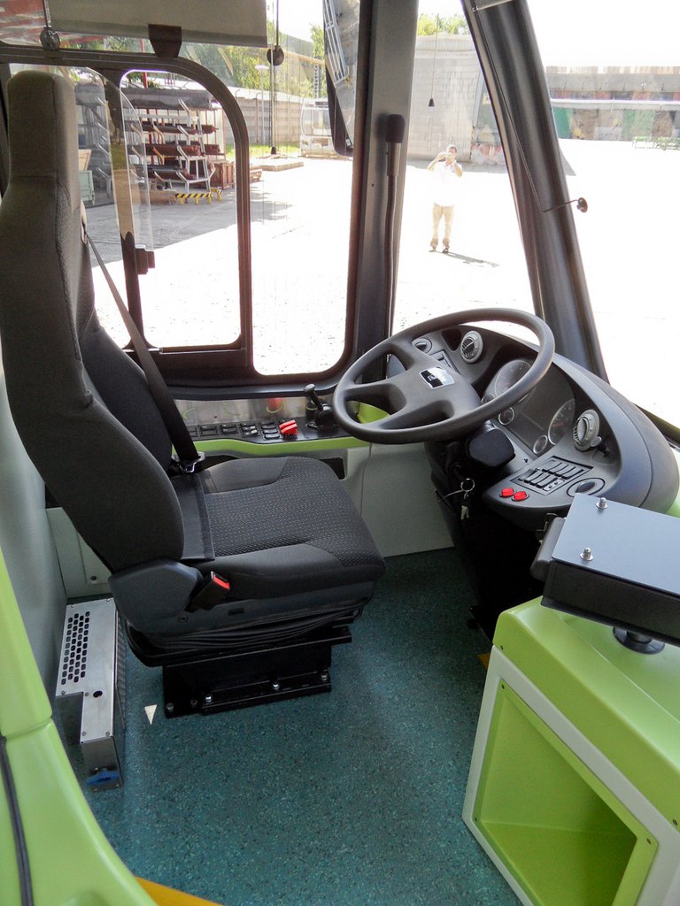 A rugózás komfortos, noha elöl is merev híd van, a karosszéria nem nyekereg, a belső elemek szilárdan rögzítettek. Tekintettel arra, hogy tulajdonképpen egy prototípusról van szó, meglepően nem barkács jellegű a busz. Igaz, a második ajtó feletti burkolat valamiért kinyílt, biztos nem zárták be rendesen. Nem tudom, mennyire könnyű tisztán tartani a világos belsőt, de tény, hogy a napi forgalomban használt városi verzió nem tűnt lelakottnak.
