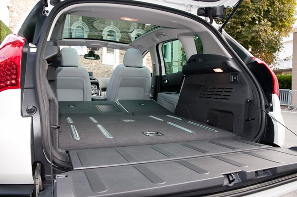 A csomagtartó már nem úszta meg ilyen jól a műtétet, 377 liter a rendes térfogat, ebből 44 liter egy rejtett rekesz a padló alatt, ide pont befér összehajtva a kalaptartó. Igaz, a Peugeot megadja „víztérfogatban” is a csomagtartót, de ez a szám – amely véletlenül jóval nagyobb a szabványos VDA értéknél – nem összehasonlítható a többi autóéval. A 3008 Hybrid4 csomagtere egy jobb ötajtós kompakttal egyenértékű, amíg nem bővítjük. Ezt könnyű megtenni, lényegében a Mazda Karakuri-rendszerét vették át: kar meghúz, ülés hasal, így már 1341 litykó.