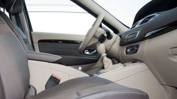 De aki megveszi, amúgy sem kívülről látja többször. A beltér egészen gusztusos ezzel a bézs-barna színösszeállítással. A műszerfal a drágább Renault modellekből ismert puha, gumiszerű műanyag, ami kifog a legszorgalmasabban kopogtató újságírókon is. Nagyon tetszett az ötlet, ahogy a fő műszeregység kikandikál a felhajtott szőnyegsarok-forma alól. A két fő színt megfűszerezték egy kevés zongoralakkal és mattezüsttel. Szerencsére itt megálltak, mert többféle műanyagot már nem bírt volna el.