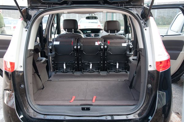 A csomagtartóban lévő két kihajtható ülést gyermekeknek szánhatták, illetve rövid távon talán kisebb növésű nőknek, de már akkor is a középső sort előre kell csúsztatni annyira, hogy az ott ülő térde találkozik a háttámlával. Ilyenkor nem túl nagy a csomagtér, alig 208 liter, ötüléses használatkor 702, kiszedett középső sorral már gigantikus 2068 liter. A középső ülések döntése, kiszedése egyszerű, visszatenni is, ha már rájött az ember a módjára. A segítő ábra ellenére én jó negyedórát próbálkoztam elsőre.