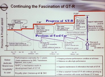 Ezen a ponton álljunk meg egy pillanatra, bámuljunk ki a sajtótájékoztató termének ablakán, és idézzük fel, mi is a GT-R. Az év szupersportautója a Top Gearnél, az Autocarnál, az Evónál, ha csak az angol sajtót vesszük. Hivatalos körülmények között, az érzelmek nélküli, elfogulatlan Stiggel a volánnál gyorsabb a Top Gear pályáján a Bugatti Veyronnál, a Ferrari 599 GTO-nál, a Lambo Murciélago LP640-nél, a Porsche Carrera GT-nél, az Audi R8 V10-nél, és még hosszan gépelhetném.