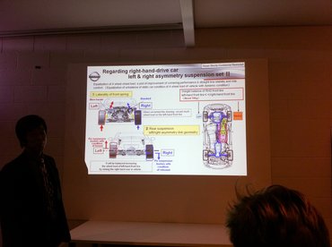– Na, hogy? (nevet) Minden tesztelt GT-R azonos a megvásárolható, kereskedelmi forgalomban lévő standard modellel. A legtöbb gyár például 9 cm-es hasmagasságú szupersportautókat készít. Ausztráliában 11 cm a kötelező minimum, ezért mi az egész világra egyféle autót gyártunk. No, de hogy mitől kanyarodik gyorsabban, mitől gyorsabb pályán mint a többi autó? Egyszerű. Már sokszor elmondtam. A súlyt a tapadás növelésére kell fordítani. (Elkéri a laptopját egy kolléganőtől) Szóval, miért használunk 20 hüvelykes gumikat? Mutatom: ez itt a kerék közepén a tengely magassága. Ez meg itt a transaxle (a hátra épített váltó/diffi egység) tömegközéppontja, ami alacsonyabban van. Ez az egész egység - terhelés alatt - mozog. Úgy mozog, hogy az átterhelődése segítse a tapadást. Szóval a felfüggesztés, a rugók, a szilentek, gumielemek és a transaxle felfogatása egy egységet alkot. Lehet, hogy az autó maga magasabb, mint a többi, de az egyensúlya így jó. Azért kell a 20 hüvelykes kerék is - ami ugye elég nagy - mert így a tömegek nagy részét a tengelyvonal alá lehet csoportosítani. A lényeg a tengelyvonal magasságának és az autó tömegközéppontja magasságának a viszonya. Egy normális autó nem így épül fel. A terhelés magassága nagyon fontos eleme a kanyarképességeknek. Ugyanezen az elven kanyarodik a Sinkanzen is. Ott is kritikus az átterhelődés a kanyarodáshoz. A vonatnál ez egy aktív rendszer, az autónál még nem. De az lesz. És ezt a GT-R-nél alkalmazott felépítést a jövőben szabadidőautókon is használni fogjuk. Ez nem marad szupersportautó-technológia, hanem általános autófelépítés lesz belőle, különösen a magas építésű kocsiknál. A Ferrari, a Porsche, a Lamborghini mind speciális felépítésű autó. A GT-R kialakítását meg tudják örökölni a szériamodellek is. Egy többcélú fejlesztési csomag, ha úgy tetszik.