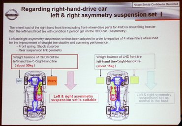 – Ugye érti, hogy a 2012-es GT-R-ben oldalanként másmilyen a felfüggesztés? Hogy másak a rugók és a gátlók? Más a rugóállandó, a csillapítási karakterisztika. Szimmetrikus felfüggesztés: eltérő oldalankénti terhelés. Aszimmetrikus felfüggesztés: azonos oldalankénti terhelés. Szóval most az autó négy sarka négyféleképp rugózik, mert így lett minden sarok ugyanolyan. Mármint dinamikusan ugyanolyan.
