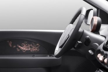 Az autó orrát, fenekét és a B-oszlopokat szolid virágminták díszítik, a tökéletes összhatás kedvéért a felnik is az előbb említett rózsaszínben pompáznak. Aki ezt már túlzásnak érzi, ne ijedjen meg, választhatja a szolidabb ezüst felnit. Viszont a virágminták annyira a Miss Sixty verzió tartozékai, hogy nélküle a csajos Twingo olyan lenne, mint egy SPECNAZ-katona ernyős denevér tetkó nélkül.