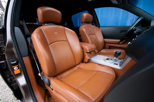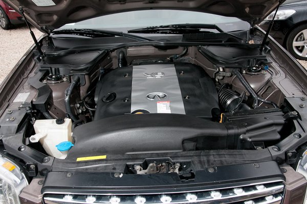 Mellesleg jó hosszú, ezen belül is hosszú orrú. Az orrban kell a hely a hosszában beépített, V8-as motornak, igaz, Amerika olcsójánosainak árulták 3,5 literes V6-ossal is, FX35 néven, szimpla hátsókerekes kivitelben. Az aktuális szériában (2008 óta) már a mostani Z 3,7 literes motorja az alap, noha maga az autó nem változott gyökeresen. Ja, és a V8-as már ötliteres, FX50 néven.