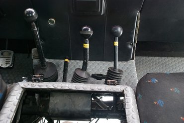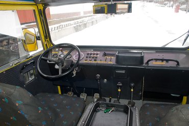 Rajtpozícióba vissza, még kicsit végignézem a Laplandert. A belső térben a kárpitozás nem eredeti (hiszen nem is volt), de a kapaszkodók, az ülések, a csillárok, a fogantyúk azok. Hátul is tombol a kánikula, köszönhető ez a két első utasülés alá beépített, benzines állófűtés rendszernek. Minden alkatrész masszív, egyszerű. Persze a két, tetőre kivezetett kipufogó csak díszítő elem, mert a valódi a jobb hátsó kerék előtt böfög a karosszéria alá, de tény, jól néz ki vele a sárga űrlény.