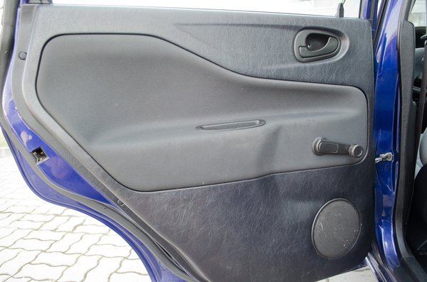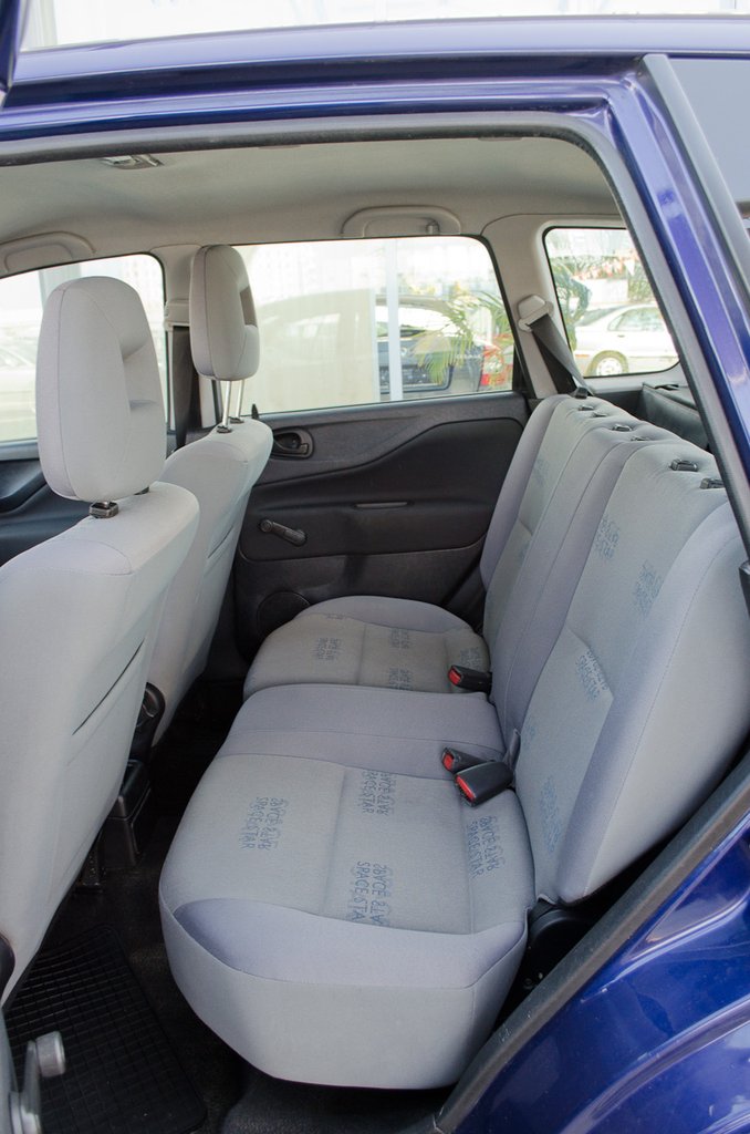 A beltér viszont érdekes. Nem a műszerfal, sokkal inkább az ülések: a kárpit a fapados légitársaságok, vagy talán inkább a chartergépek stílusában tartalmaz kék SPACE STAR feliratokat. De vajon minek kell történnie egy autóval ahhoz, hogy a fejtámla fémszárai rozsdásak legyenek? Csupa extrémül izzadó illető használta valamennyi ülést?