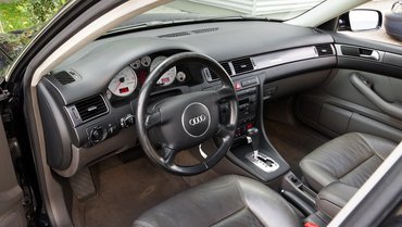 Az A6 visszataszító látványt nyújtó belseje meghökkentően egyben van. De eleinte nem ezen töri az ember a fejét, hanem azon, hogy az Audi vajon miért úgy gyártja le a fekete gombokat, hogy megcsinálja fehérből, és a felszínét bevonja fekete műanyaggal? Mert ez mind lekopott a sokat használt pontokról, a világításkapcsoló környékéről, a rádióról, az ablakemelők mellől, és még sorolhatnám. És ott van még a bőr, a kormányon már megkopva, a vezetőülésen elszíneződve, a többin csak ráncosan.