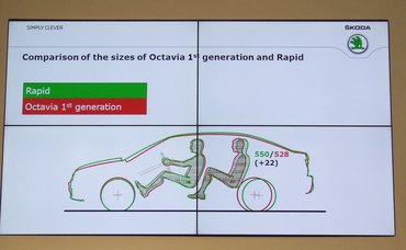 Rapid fantázianévvel már van egy autó a piacon, de az Indiában megvásárolható autó a Fabia alapjaira épült. Az új Rapid a Fabiánál nagyobb, nem sok közük van egymáshoz. Külső és belső méreteiben az első Octavia az etalon. Bár csak 1135 kg a kocsi súlya, külméreteiben, belső térkínálatában az első generációs Octavia szintjét nyújtja. A hátsó fej- és lábtérre azt mondják, az osztály legjobbja. A magam 185 centijéhez beállított vezetőülés mögé beülve még kényelmesen betettem a tenyeremet a háttámla és a térdem közé – hosszában. Széltében már nem volt ennyire meggyőző a helykínálat. Ez, ha tudjuk, hogy a Rapid a VW Polóval is szoros rokonságban áll, nem túl meglepő, de igazából 1428 milliméteren három nem túl széles pantomimművész azért elfér.