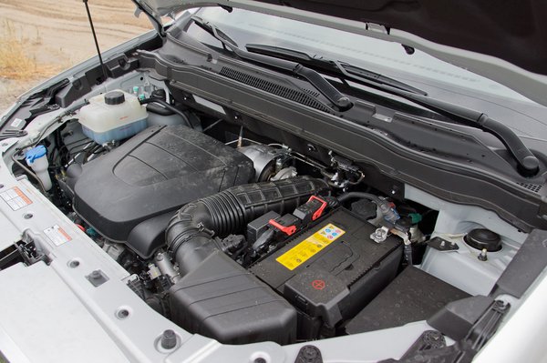 A kétliteres dízel, amiből van 149 és 175 lóerős változat, visszafogott, egykedvű kerregéssel üdvözöl; Mercedes-géneket emlegetnek a koreaiak, de saját fejlesztésnek mondják. Akár koppintás, akár nem, barátságos jellem: ezerötös fordulattól rendesen elkezdi termelni a töltőnyomást, és háromezerig szépen húz. Magasabb tartományokba nem is érdemes kergetni, mert a hatgangos váltót felpakolgatva nem lépünk gödörbe, egészen autópályatempóig kitart a lelkesedés, még a gyengébbik változatnál is.