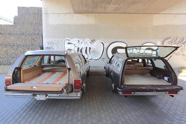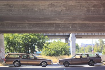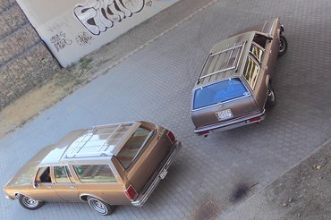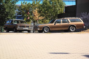 Az előttem álló két amerikai überkombi ugyanilyen. Az egyik egy Chevrolet Impala, a másik egy Oldsmobile Cutlass Cruiser, mindkettő 1980-ból. Az Olds az amerikai besorolás szerint mid-size, míg az Impala full-size. Az utóbbi azért különösen vicces, mert az 5,4 méter hosszú, hatodik generációs Impala már egy drasztikus downsizing áldozata, és harminc centivel rövidebb elődjénél. A GM több mint félmilliárd dollárt költött a fejlesztésre melynek komoly része volt a downsizing. Emiatt már csak 1,9 méter széles. Persze a fejlesztés jót tett a súlynak, ami közel négyszáz kilós fogyást hozott, lecsökkentve az Impalát potom 1,9 tonnára.