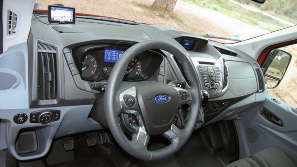 Belül tényleg személyautós, nagyon hasonlít a Transit Customra. A motoros ülésállításnak nem sok értelmét látom, ha nincs memória funkció, márpedig a Transitban nincs. Ha lenne, minden sofőr egy gombnyomásra a saját beállításait hívhatná elő, így viszont csak felesleges drága biszbasznak tűnik. Talán csak azért nem teljesen értelmetlen, mert több mindent lehet rajta állítani, mint a teljesen manuális székeknél. Mindenesetre nyomát sem találtam az előző Transit hátnyomorgató támlájának, pár gombnyomással, meg a kormányoszlop fel-le és ki-be állítgatásával pillanatok alatt megvolt a kényelmes pozíció. A raktérben egy 450 kilós, jól lespaniferezett ál-rakomány terhelte a kocsit, amitől kellemesen rugózott, de nem ült a segge. Mondjuk, a kellemes rugózáshoz kell a hosszú tengelytáv, már az irdatlan hosszú Sprinternél is megállapítottam, hogy ha az első és a hátsó tengely közt elég nagy a hézag, nem bakkecskézik még egy terheletlen furgon sem.