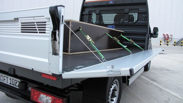 A nagy dobozos csendesen gurult, alig voltak vibrációi, de a platós – hiába volt 600 kilónyi teherrel megrakva – nyersen, teherautósan viselkedett. A futómű elvileg ugyanolyan, ezért arra gondolok, hogy a profilokból hegesztett létraalváz, és a plató miatt annyira más a két kasztni viselkedése. Finoman remegett, kicsit bukdácsolósan ment át a fekvőrendőrökön. Javára írandó, hogy ez az L2 hosszúságú kasztni bitang kis helyen tud megfordulni, 11,9 méteres fordulóköre a kategóriában a legkisebbnek mondott. A tesztautón a kisebbik, de nagyon szép kivitelű plató volt, aminek a hátfalán réseket vágtak, hogy lehajtva se takarja el teljesen a hátsó lámpákat. A csarnokban kiállított hosszú platóson már az erősített, fényezett oldal- és hátfalak voltak, amik lehajtva sajnos takarták mindkét lámpatestet. Érdekes volt, hogy a hátfalat rögzítő sodrony pont vízszintesig engedte azt, de az oldalfalat már nem engedi ennyire lenyílni, ha valamit le akarunk róla csúsztatni, mindenképpen ki kell akasztani a 180 kilós teherbírású, rozsdamentes acél karabinert.