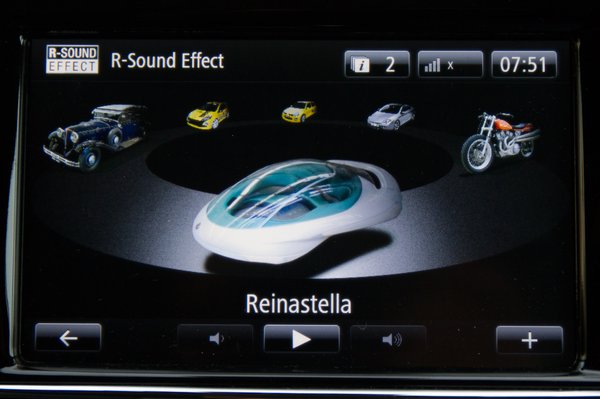 Az érintőképernyős multimédiás R-link rendszer egy picit akadozik és kétszer le is fagyott. Az egyik alkalom sajnos akkor történt, amikor valakinek meg szerettem volna mutatni, hogy az R-sound egység még űrhajó hangot is tud utánozni az autó belterében, milyen jól lehet szórakozni ezzel. Ekkor beakadt a rendszer maximális hangerőn űrhajóban. Ha próbáltam kikapcsolni, akkor az „Ön autójában ez a funkció nem elérhető” tájékoztató szöveget kaptam. Csomókban kezdett hullani a hajam az űrhajó visítástól és csipogástól, úgyhogy megálltam, leállítottam, kivettem a kulcs nélküli indítás kártyáját a tartójából, elmondtam egy rövid fohászt és újraindítás után megjavult a rendszer. Kis dolgoknak is nagyon lehet örülni, a Clio megtanít erre is. Tudják, egyéniség. A rendszer első hallásra hülyeségnek tűnik, és az is valójában, de profi módon van megcsinálva. Többféle hangot bekapcsolhatunk, ami a jármű hangszóróiból szól, de fordulatszám és gázpedál állás, tehát terhelés arányosan, akár zene vagy a telefonálás alatt is. A hangerejét jól beállítva simán elhisszük, hogy egy V6-os motor hubog elöl, jó szórakozás.