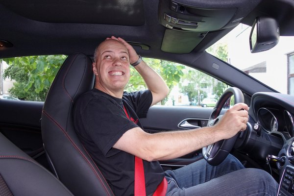 A szárnyalás azonban rögtön veszít egy ékezetet, mihelyt a komfortra terelődik a szó. A GLA ugyanis örökölte az A osztály architektúráját, így a két autó doboza kvázi azonos méretű. Ennélfogva a hátsó ülésein roppant szűk a hely, nem egy, és nem két kiskocsi akad, amelyik több helyet kínál itt. A helyzetet rontotta, hogy a kérdéses GLA-t mi tolótetővel kaptuk, amely ugyan egyszerre tesz jót a kocsi villantási faktorának és a Mercedes könyvelési részlegén dolgozók wohbefindungjának, de pokoli sokat ront az eleve szűk marokkal mért belső centiknek. Életemben nem vertem be fekvőrendőrön annyit a fejem a tolótető szegélyébe, mint ebben a kocsiban, pedig a tesztelés félidejére már külön reflexet fejlesztettem ki arra, hogyan húzzam össze magam picire a bukkanók előtt, akár Münchausen sztorijában a tengerészek, akiknek beszalad a fejük az ingükbe.