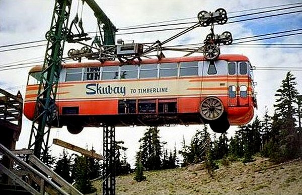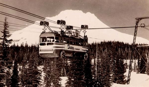 Ez volt az egyetlen megvalósult repülő busz ötlet, ami nem igazán repült, de mégis úgy nézett ki, mintha szállna. Az oregoni Mount Hood-on épült meg a fura sífelvonó szerkezet, amin egy, a földet nem érintő trolibusz közlekedett, mindössze öt évig.