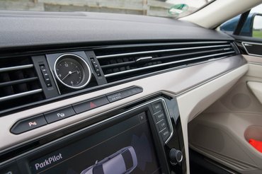 2014 divatja a mutatósóra-művészet. Minden magára valamit is adó gyártó óraremekműveket tesz a műszerfal közepébe: Lexus NX300h, Ford Mondeo, Hyundai Genesis, hirtelen ezek ugranak be. A krómpálcás rácsozás miatt mégis a Passaté érvényesül a legjobban. Nem a gombok közé szórták be, hogy a figyelemért viaskodjon a villódzó izék tömkelegében, hanem feltették magasra, megszakítva a krómlécek futását.
