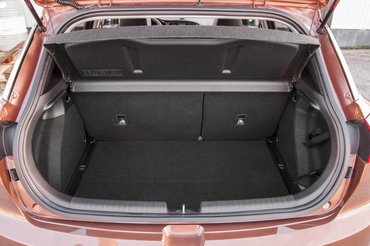 Vállban is sokkal jobban eleresztették, mint a miniket általában. Nem is értem, honnan faragták ki ezt a pusztító méretű barlangot, nem illik ilyet ebben a kategóriában. Ami meg végképp érthetetlen: a csomagtartó térfogata nem 2-essel, hanem 3-assal kezdődik – kisautóknál szinte ismeretlen ez a szám. Ja, hogy mennyi? 326 liter. Az sok. Ráadásul a csomagtartó ilyen átrakható dupla padlós, ami szintén nem tipikus. Talán csak rekesz-vonalon vérzik el az autó – pohártartó ugyan van, mobiltartó üreg is, de az ajtózsebek ügyetlenek, középen kevés a hely, de ez legyen a legnagyobb baj. Mondom, KISAUTÓ!