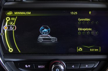 Sok. Érzésre is kicsit sok a bling-bling, a mindenféle apró rekesz, csetresz, krómbiszbasz, kiskapcsoló, nagykapcsoló, üzemmódválasztó, sport-gomb, adaptív-futóműállítás, USB, Bluetooth, média, navi, tapipad...ehh... lehet, öregszem, de egy élményautóban engem már zavarnak ezek a dolgok. Szerencsére a JCW tud olyan hiperaktív és szórakoztató lenni, hogy mindezeken felül zseniális maradjon. Mert menni vele még mindig sokkal-sokkal jobb, mint megnézni, hogy MINIMALISM üzemmódban mennyit növekszik a kis légbuborék a halacska feje felett. Ez olyan németes humor (és kötelező elem gondolom), megkérni a kétliteres benzines turbómotoros hot-hatchet, hogy ne fogyasszon sokat. Egy vicc. A 9,4 liter még így is remek eredmény, hiszen...