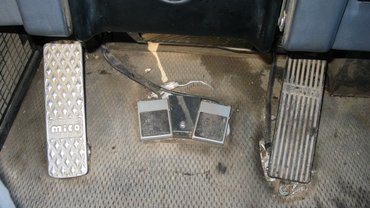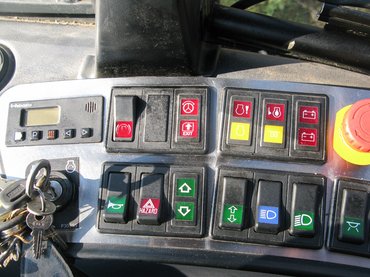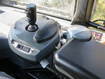 Elvileg kényelmes acéllétrán lépdelhetnék, amely – tetszik az ötlet – magától csapódik fel, mikor egy gombnyomással kioldja a rögzítőféket a vezető. A létra azonban szezon közben letörött, pótolni egy nagyobb szerviz során fogják, így a tolólap szolgál mászókaként. Odabent mintha az elvarázsolt kastélyban lennék: egyik meglepetés a másik után. Fotel vár, mindkét karfáján egy-egy joystick a darukezeléshez (ezekhez nem nyúlhatok) és egy csomó gomb, kapcsoló, például a menetirány-választáshoz, az erőáttétel fokozatváltásaihoz, a diffizárakhoz. Gáz- és fékpedál, de az utóbbit szinte el lehet felejteni, mert gázelvételre azonnal és határozottan megáll a gép. Csak akkor kell fékezni, ha lejtőn túlzottan felpörgetné a dízelt a motorfékezés.