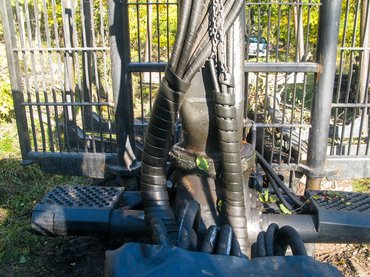A fülke mögött áll a daru. Minden mozgása hidraulikus, képes 360 fokkal elfordulni, kinyúlni és visszahúzódni, emelni és süllyeszteni, a gém végén függő kanalat szétnyitni és összezárni, illetve jobbra-balra forgatni. Rögtön az elején tisztázzák, hogy vezethetem a Buffalót, de nem daruzhatok, mert két joystick összehangolt kezelését kell hozzá készség szinten begyakorolni, ami nehéz és hosszadalmas tanulási folyamat. Ezen kívül, eltérően a nagy teherbírású építőipari daruktól, ennek a mozgása nagyon gyors, egy szempillantás alatt okozhatnék komoly kárt. Ekképp kioktatva mászom fel mai mentorom, Attila mellé a fülkébe.